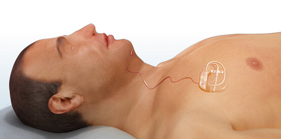 Sobald der Patient einatmet, aktiviert eine Elektrode gezielt die Zungenmuskulatur – präziser formuliert den Zungennerv (Nervus Hypoglossus). Diese elektrische Stimulation verhindert, dass die Zunge während des Schlafs erschlafft und in den Rachenraum zurücksinkt, wo sie andernfalls die Atemwege blockieren würde. Auf diese Weise kann die Atemluft ungehindert in die Lunge gelangen.