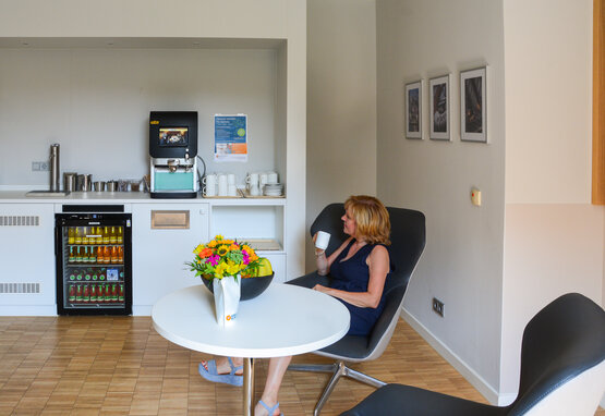 Unsere Privatpatienten-Lounge steht Ihnen und Ihrem Besuch exklusiv zur Verfügung. Hier genießen Sie bequeme Sitzmöbel, eine rund um die Uhr geöffnete Getränkestation mit Heiß- und Kaltgetränken, frisches Obst, kleine Snacks und nachmittags Kuchen. Nutzen Sie die Lounge als Rückzugsort, für Gespräche oder einfach zum Entspannen.